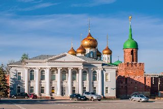 На площади Ленина друг напротив друга расположены здание областной администрации и Тульский кремль. Два строения из разных эпох разделяют около 150 м и более 400 лет. Образец советской архитектуры в стиле конструктивизма многие считают негармоничным. Но на контрасте с холодными серыми линиями его фасадов ярко выделяется нарядный Успенский собор.